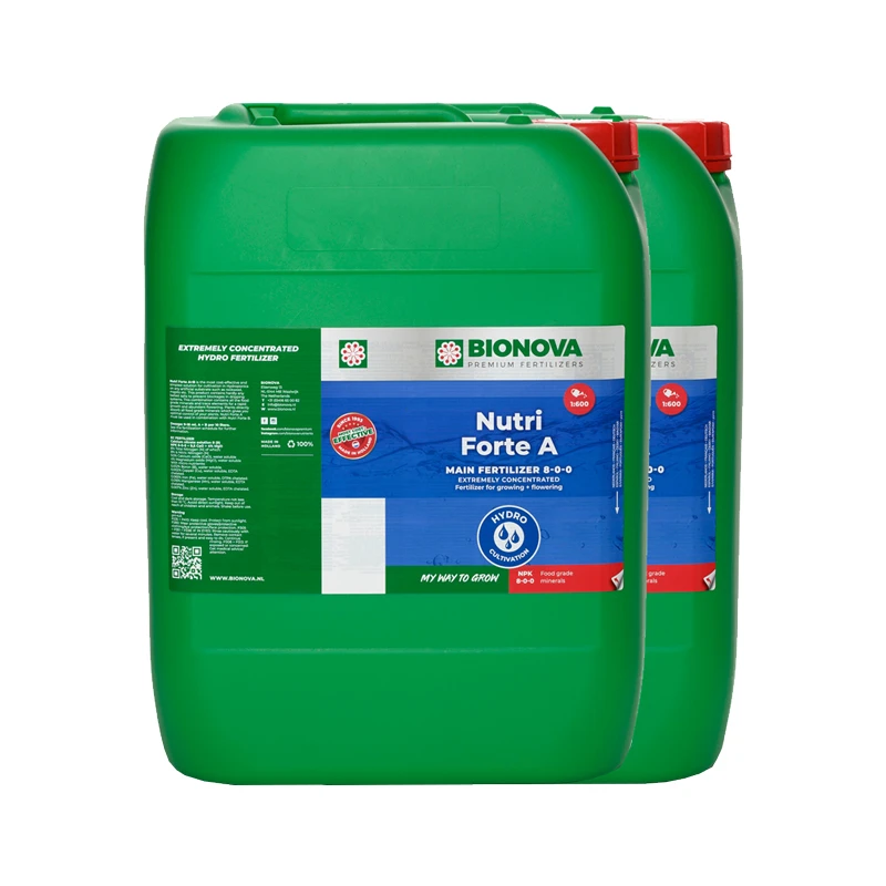 Nutri Forte A+B Hydro di Bio Nova è la soluzione più semplice ed efficace per la coltivazione idroponica su un substrato artificiale, come lana di roccia, mapito, ecc. Questo prodotto è quasi privo di sali di zavorra, per prevenire occlusioni nei sistemi di irrigazione a goccia. Questa combinazione contiene tutti i minerali alimentari e gli oligoelementi per una rapida crescita e una fioritura abbondante. Le piante assorbono direttamente tutti i minerali alimentari, garantendo un controllo ottimale sulle colture. Nutri Forte A deve essere usato in combinazione con Nutri Forte B.