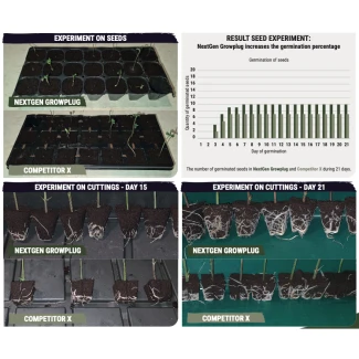 Nach der sichtbaren Bewurzelung muss der Plug in ein Kultursubstrat verpflanzt werden. NextGen Growplugs sind so konzipiert, dass sie während des Umpflanzens intakt bleiben, was die Handhabung erleichtert und sicherstellt, dass die Wurzeln der Pflanzen nicht beschädigt werden.