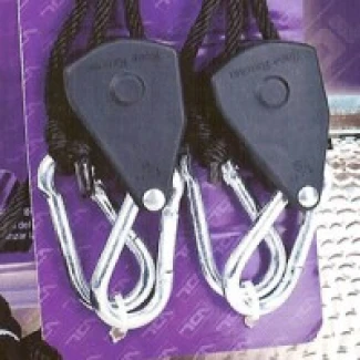 Pair of pulleys with metal carabiners for holding accessories in grow rooms.