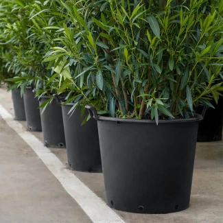 Der Mastello ist ein Anzuchttopf aus schwarzem Polyethylen, das aus Recyclingmaterial hergestellt wird und mit seitlichen Griffen für eine einfache Handhabung ausgestattet ist.