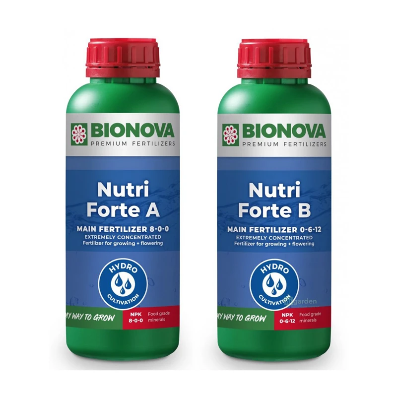 Nutri Forte A+B Hydro from Bio Nova is the simplest and most effective solution for hydroponic cultivation on an artificial substrate such as rockwool, mapite, etc. This product is almost free of ballast salts to prevent occlusions in drip irrigation systems. This combination contains all food minerals and trace elements for rapid growth and abundant flowering. Plants directly absorb all food minerals, ensuring optimal crop control. NutriForte A should be used in combination with Nutri Forte B.