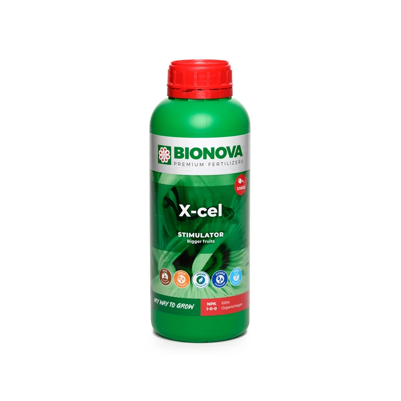 Bio Nova X-cel is a 100% organic/vegan certified growth and flowering stimulant that can be used on all types of crops. The natural extracts of kelp, humic acids, amino acids, trace elements and bacteria stimulate metabolism, especially photosynthesis, and consequently the formation of carbohydrates, enabling XL-sized flowers! X-cel significantly increases the quantity and quality of the yield. X-cel can be mixed with all fertilisers and plant care products.