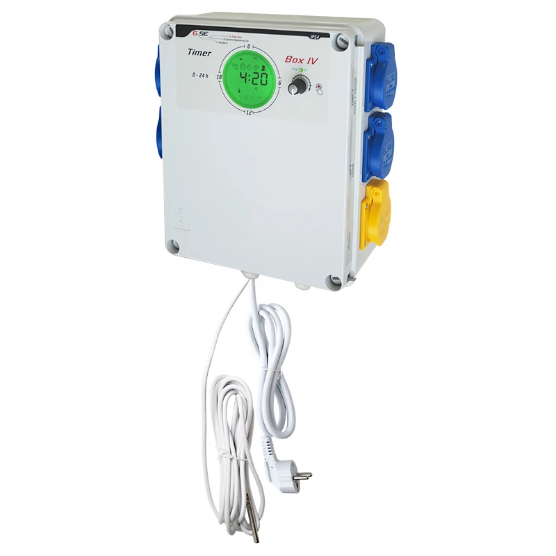 El Armario de Interruptores con Temporizador IV se suministra como producto acabado y listo para su uso. Este fiable panel de control con temporizador tiene una cubierta sellada IP54 (la clase de protección ofrece protección contra salpicaduras de agua desde todos los lados), enchufes con tapas abatibles y un sensor de temperatura de bajo voltaje, lo que lo hace perfecto para entornos húmedos. El controlador se suministra con un cable de alimentación de 1,2 metros y un cable sensor de 4 metros. Si es necesario, puede ampliarse hasta 10 metros.