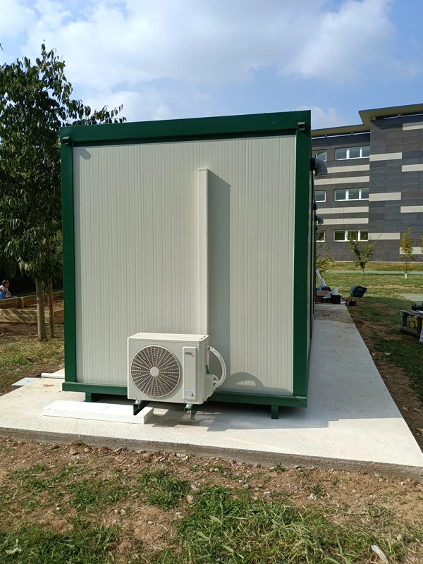 Prefabricado para exterior 1200x240x270hcm completo con base, paredes de panel sándwich, puertas y ventanas de aluminio/PVC blanco, sistema eléctrico y aire acondicionado.