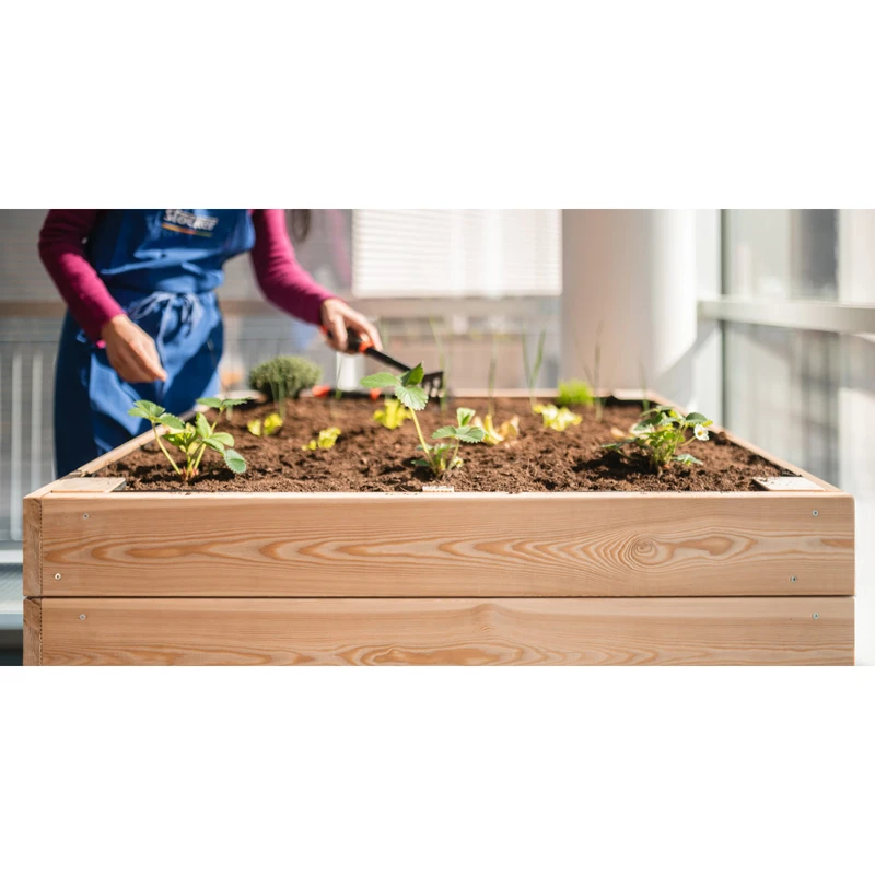 Elevego es una solución duradera y respetuosa con el medio ambiente para el huerto urbano, ya que está fabricado con madera de alerce robusta y sin tratar. Es resistente a la intemperie, extremadamente estable y tiene una profundidad de 30 cm, lo que permite un desarrollo óptimo de las raíces de las hortalizas.