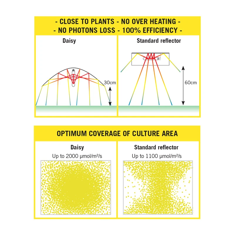 La luce emessa dalla lampada non irradia direttamente le piante ma indirettamente, infatti è la luce riflessa dall'ampio riflettore ad ombrello; in questo modo è possibile posizionare il riflettore più vicino alle vostre colture senza creare dei punti di calore eccessivi.