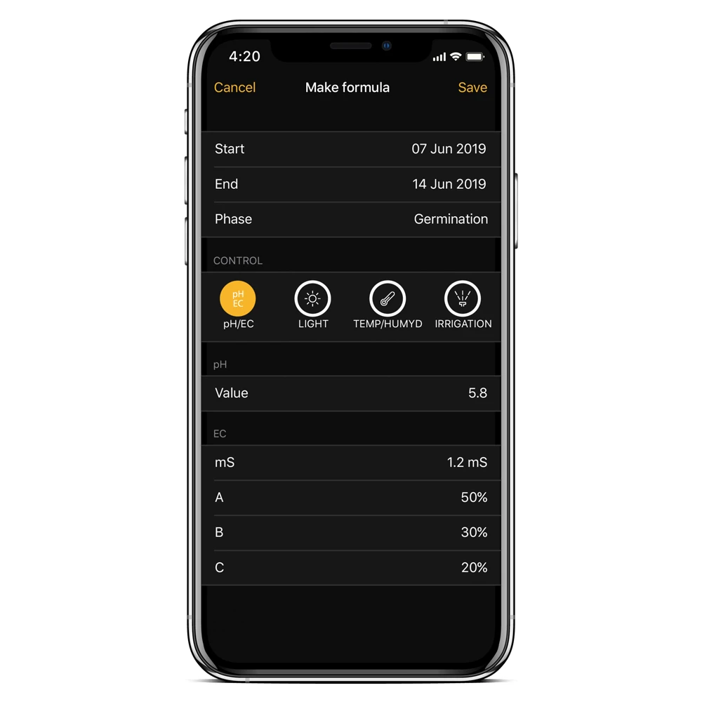 Si eres un cultivador chapado a la antigua al que le gusta elaborar sus propias recetas, o un innovador al que le gusta experimentar, puedes poner tu creatividad y experiencia al servicio del cultivo MANUAL. Crear nuevas recetas de cultivo es tan fácil como poner una cita en tu calendario, el sistema hará el resto.