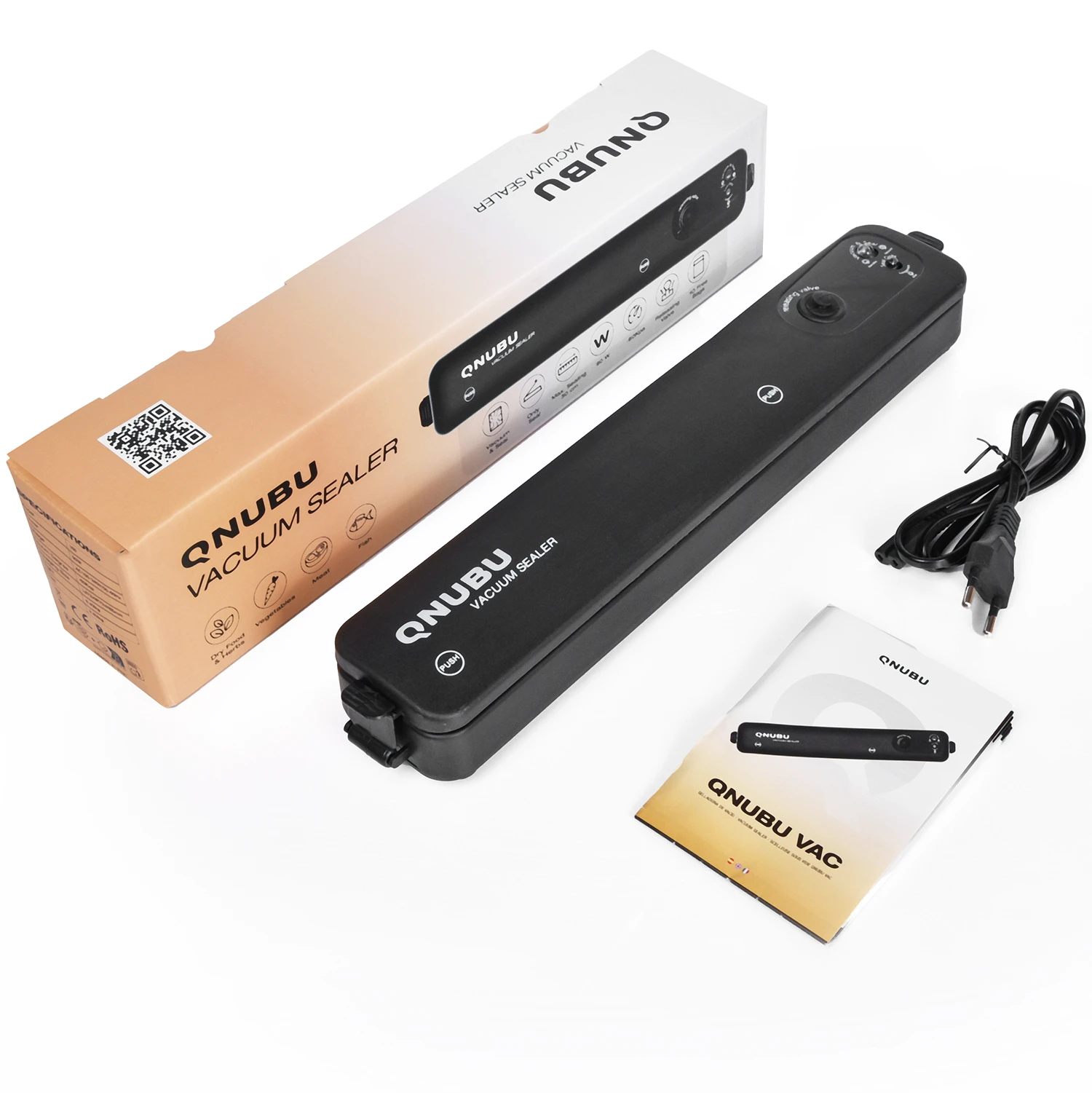 La machine d'emballage sous vide QNUBU VAC est conçue pour l'emballage sous vide de différents types de produits. Deux fonctions sont intégrées: la mise sous vide automatique et le thermoscellage ou le simple scellage. En appuyant sur un bouton, vous pouvez sceller des sacs sous vide et conserver vos produits plus longtemps en toute simplicité. La solution idéale pour l'emballage à domicile.