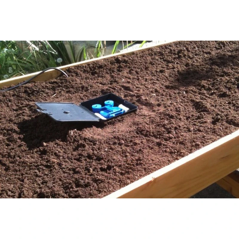 AquaBoxen benötigen keinen Strom, keine Pumpe, keine Zeitschaltuhr und keinen Netzanschluss und sind ideal für den Einsatz im Gemüsegarten oder im Hausgarten. Ein Anschluss an ein Reservoir ist alles, was benötigt wird. Das Wasser aus dem Tank wird der Aquabox durch einfache Schwerkraft zugeführt.