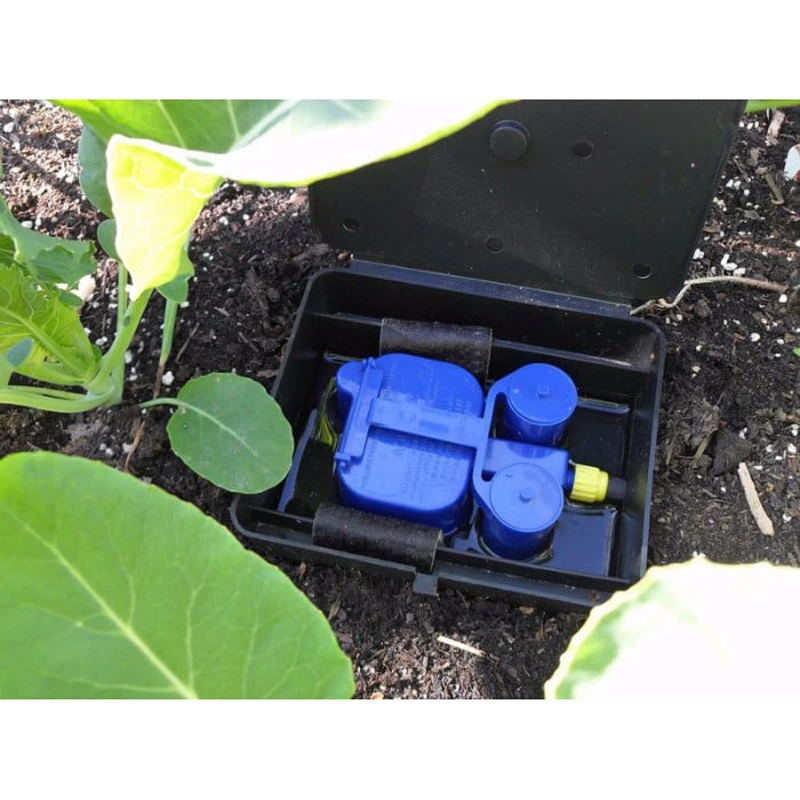 Gli AquaBox non richiedono elettricità, pompe, timer o allacciamneto alla rete elettrica e sono ideali per l'uso in orti o giardinaggio domestico. Una connessione a un serbatoio è tutto ciò che serve. L'acqua dal serbatoio verrà fornita all'Aquabox per semplice gravità.