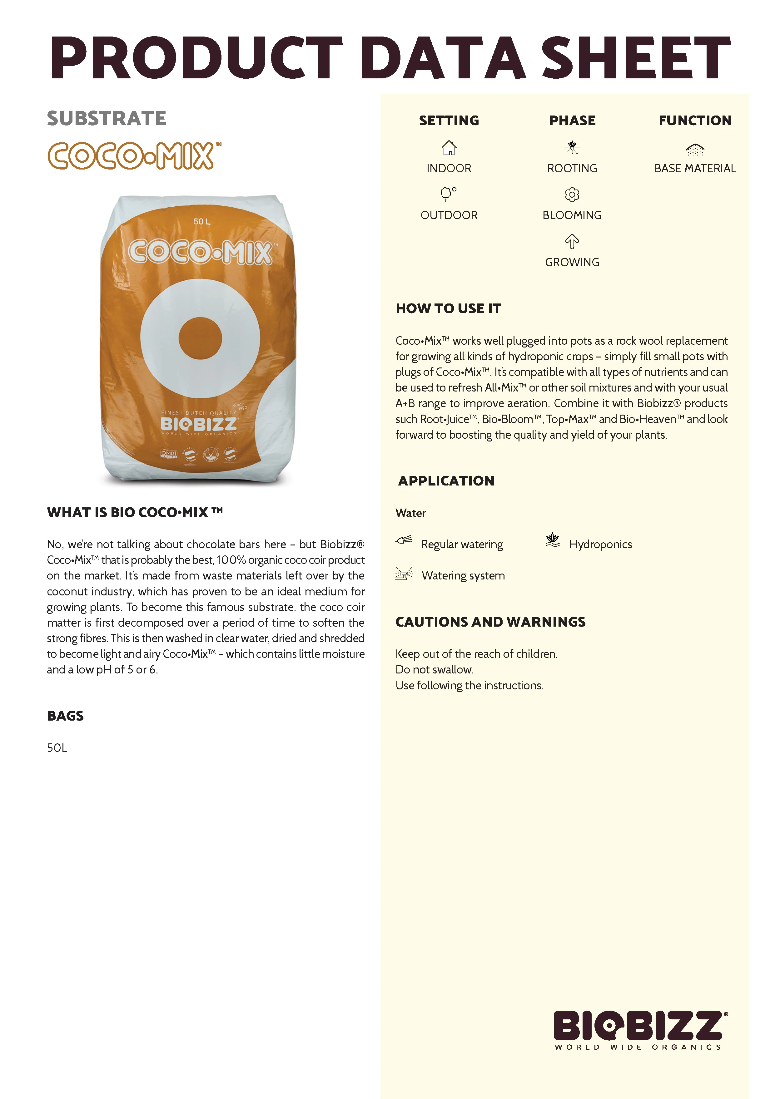 Coco-Mix™ funktioniert auch in Töpfen als Ersatz für die Steinwolle, die für alle hydroponischen Kulturen verwendet wird: Geben Sie einfach Coco-Mix™-Pakete in die Töpfe. Da es mit allen Nährstoffen kompatibel ist, eignet es sich ideal zum Auffrischen von All-Mix™ oder anderen Erdmischungen, aber auch mit einem normalen A+B-Kit zur Verbesserung der Belüftung. Kombinieren Sie es mit Biobizz® Produkten wie Root-Juice™, Bio-Bloom™, Top-Max™ und Bio-Heaven™, um den maximalen Ertrag zu fördern und die Gesundheit Ihrer Pflanzen zu stärken.