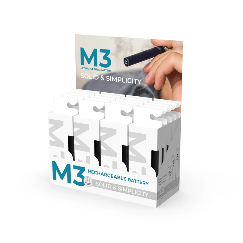 El diseño en forma de bolígrafo hace que la batería M3 sea cómoda de transportar. Su carcasa es de acero inoxidable y la carga se realiza a través del conector 510/USB suministrado. La activación de la resistencia mediante inhalación, el ajuste autoadaptativo de la temperatura óptima y el diseño sin botones hacen que el M3 sea perfecto para cualquier cartucho y fácil de usar.