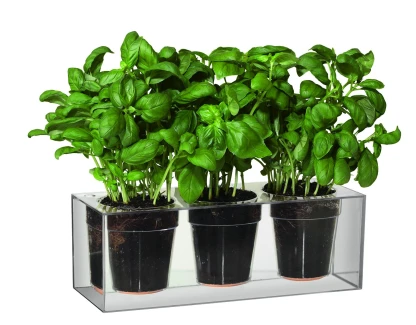 Está admirando la maceta CUBE de BOSKKE, una maceta de policarbonato transparente con un depósito de agua en su interior.
