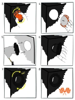 Bohren Sie mit dem entsprechenden Schneidewerkzeug (im Lieferumfang enthalten) ein Loch in die Zeltwand, schrauben Sie den Flansch an und verlegen Sie die Kabel durch diesen Kanal. Das Rollo kann nun vollständig geschlossen werden.
