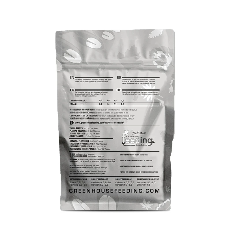 Hybrid feeding contains less ammonia nitrogen and higher amounts of magnesium, which is advantageous for hybrid varieties with a flowering time of 8-10 weeks and plants grown in hydroponic systems. The higher amount of magnesium and sulphate stimulates the production of essential oils, terpenes and flavonoids.