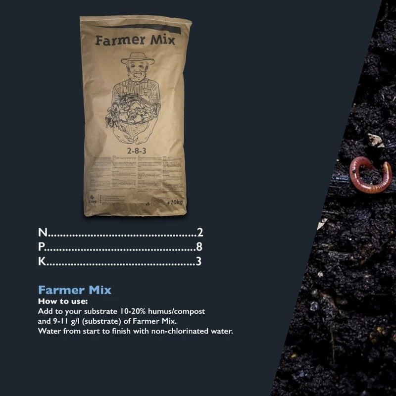 Farmer Mix es una mezcla orgánica altamente concentrada diseñada para simplificar el cultivo en tierra viva, proporcionando una nutrición equilibrada y actividad microbiológica durante todo el ciclo de cultivo.