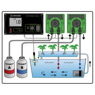 El controlador y la bomba de conductividad (CE) Milwaukee MC745 PRO permiten medir y regular automáticamente los niveles de CE.