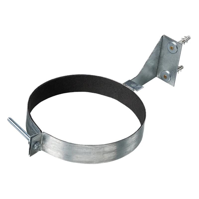 Collier de serrage avec support mural pour la fixation de conduits d'air, de ventilateurs d'extraction, de brides et de filtres.