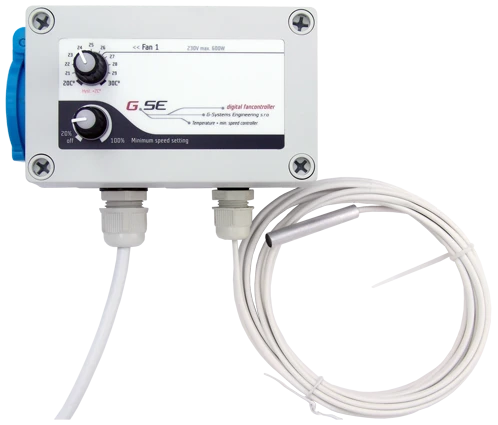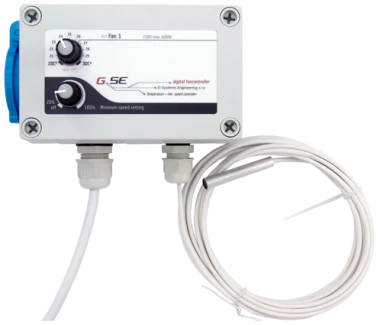 The GSE temperature and minimum speed controller is able to modulate the air extraction speed according to the desired room temperature. GSE keeps the room temperature constant by preventing it from dropping below the desired value. In case the temperature rises above the set value, the regulator will increase the extraction speed gradually, reaching 100% power beyond 2°C from the desired temperature. It is easy to use: to program the desired temperature and minimum speed of the extraction system, simply use the two knobs. This appliance comes ready to use and requires no wiring. The extractor is connected via a German socket. The temperature sensor operates at low voltage and is therefore perfect for very humid environments.