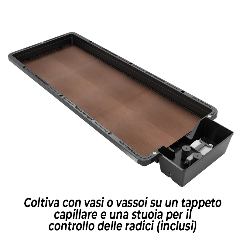 Lorsque les pointes sont retirées et que le tapis capillaire est en place, Tray2Grow peut contenir jusqu'à quatre plateaux de semis de taille standard, deux plateaux de microherbes, un nombre quelconque de pots organiques ou à fond perforé, ou le grand bac en tissu de 107,5 L.Trois trous de guidage de chaque côté du plateau sont prévus pour les cannes de jardin si vous palissadez des plantes, et il y a trois niveaux à bulle pour vous aider à vous assurer que tout est de niveau à 100 %.