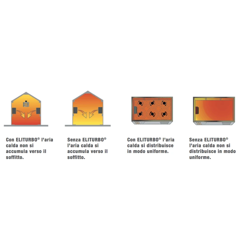 ELITURBO® impedisce la stratificazione dell'aria calda a soffitto, migliora la qualità e il benessere dell’ambiente lavorativo e produce un elevato risparmio energetico.
