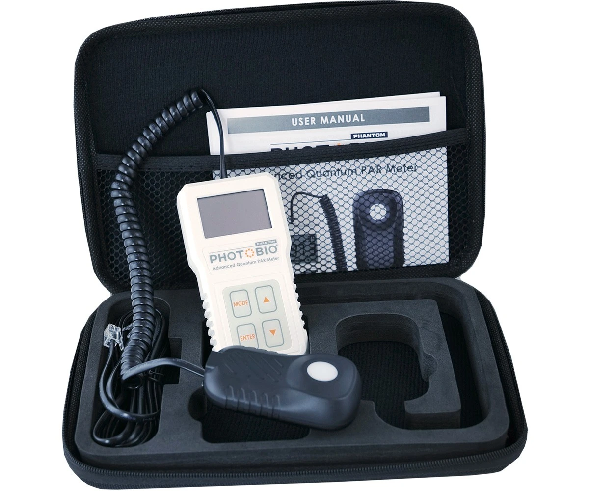 El medidor de PAR PHOTOBIO de Advanced Quantum proporciona mediciones precisas y cómodas para cualquier fuente de luz utilizada en aplicaciones hortícolas. Está diseñado para medir el flujo PAR (radiación fotosintéticamente activa) en longitudes de onda entre 400 y 700 nm. Existe una relación proporcional positiva entre el número de fotones absorbidos en la banda de 400 a 700 nm y la tasa de fotosíntesis, que es importante para maximizar el rendimiento de los cultivos.