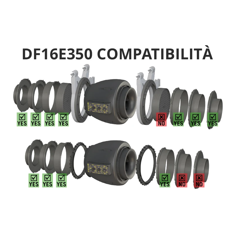 Vous pouvez utiliser l'extracteur avec n'importe quel filtre standard en utilisant un connecteur et un manchon en caoutchouc correspondant à la taille du filtre. Il peut également être installé sur toutes les tentes sans bride de ventilation en ajoutant un KIT D'ADAPTATEUR DF16, compatible avec les poteaux de 16 à 22 mm.