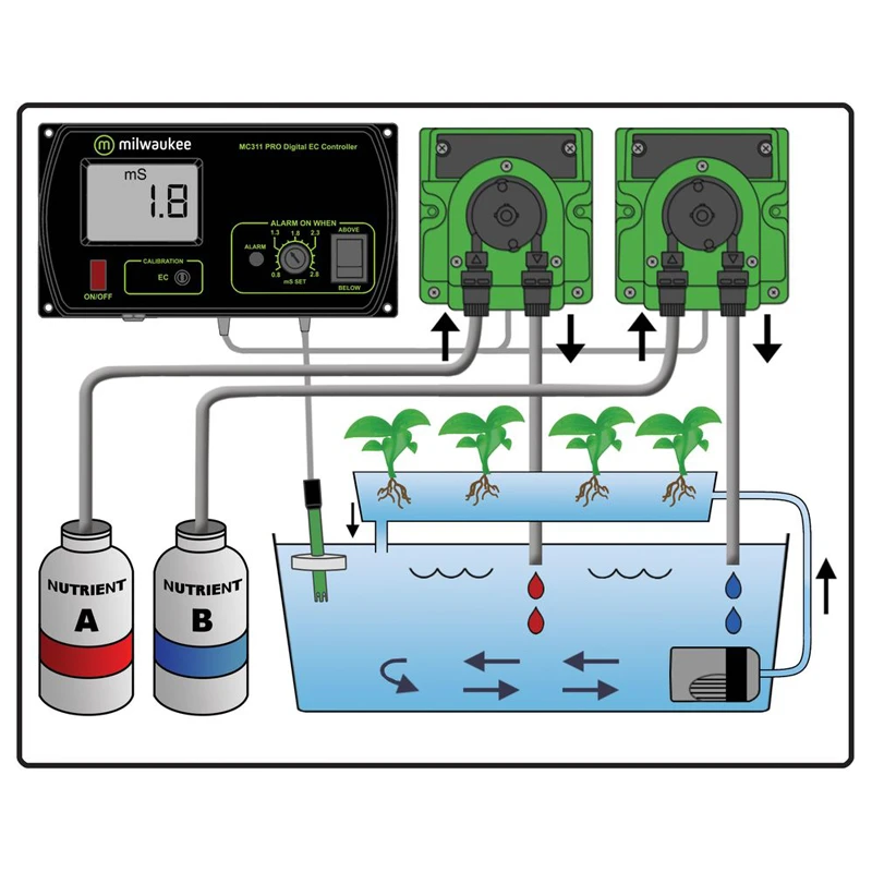Il kit MC745 include il controller EC MC311 e due pompe dosatrici MP810 per monitorare e ottimizzare automaticamente i livelli EC. Basta impostare i parametri EC e lasciare che il controller EC Milwaukee e le pompe facciano il resto.