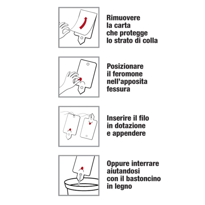 Doppio uso, appesa: rimuovere la carta siliconata che protegge lo strato di colla sui due lati, posizionare il feromone nell’apposita fessura, inserire il filo nel foro e appendere la trappola.