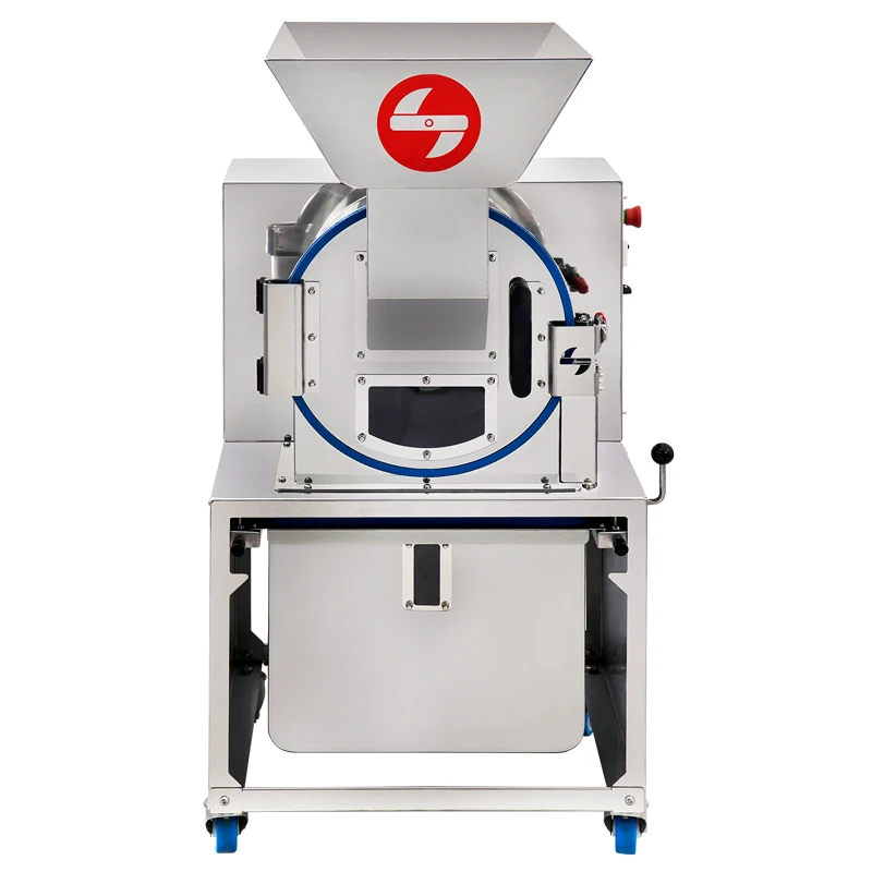 Fabriqué en acier inoxydable, il est 100 % conforme aux BPF. Sa grande trémie de 50 litres permet un chargement manuel maximal et sa boîte de collecte d'une capacité de 45 litres facilite la gestion du produit, avec une fenêtre d'indication du chargement permettant de contrôler l'ensemble de la production.