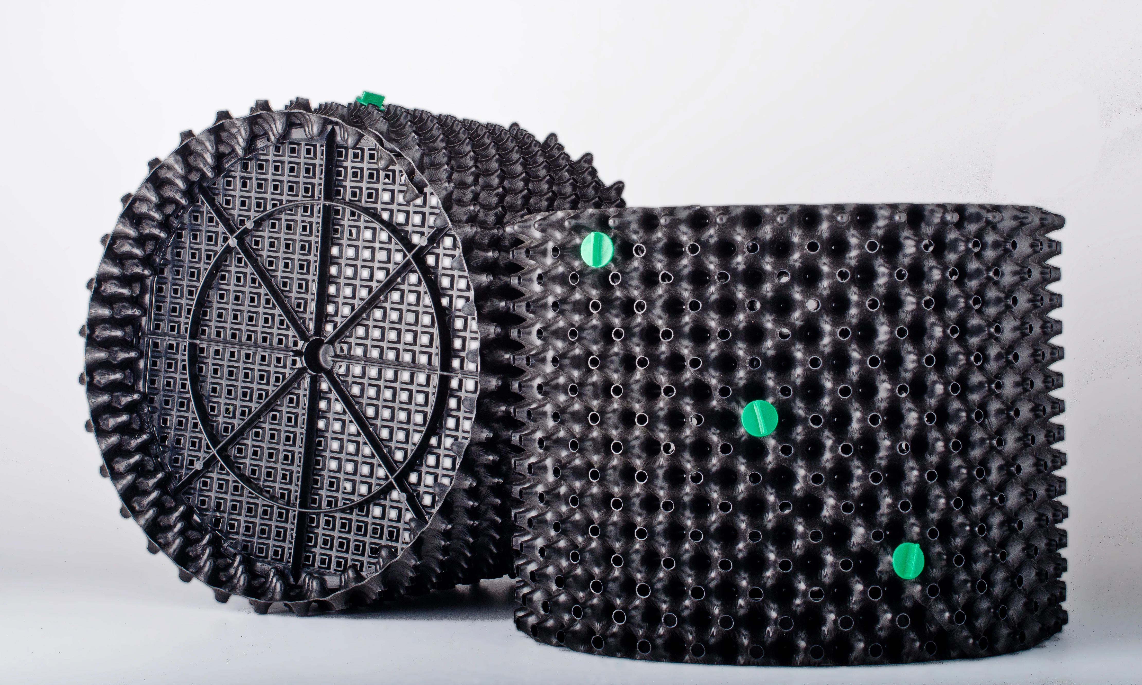 Produced from recycled HDPE, Superoots Air-Pot is circular in shape, with a perforated wall that is designed like egg cartons. There are no flat surfaces for the roots to start the spiralling process.