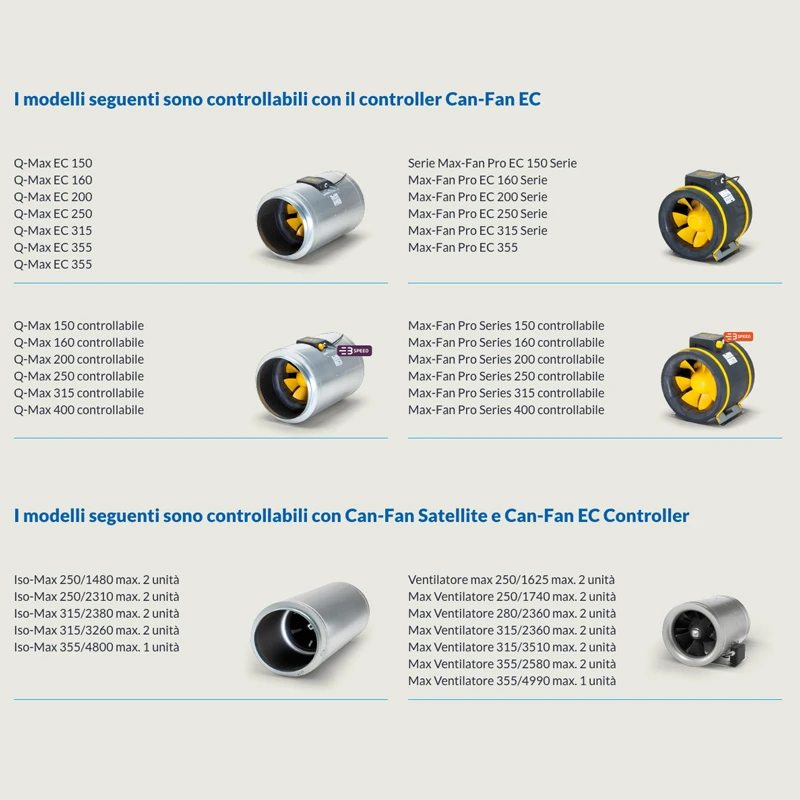 Can-Filters ha añadido hardware adicional a los Max-Fan Pro Series AC y Q-Max AC. Este hardware adicional permite que el controlador LCD EC Fan se comunique directamente con los Max-Fan Pro Series AC y Q-Max AC. Esto permite que el controlador LCD EC Fan controle sus dispositivos AC.En resumen, un ajuste de hardware relativamente pequeño abre todo un abanico de posibilidades y evita inversiones innecesarias en controladores caros con un amperaje limitado.
