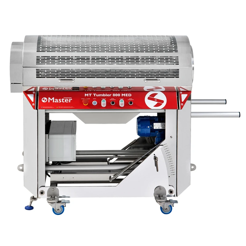Wir wissen, dass Wartung und Reinigung für eine optimale Produktion und die beste Schnittqualität unerlässlich sind. Deshalb ist der MT Tumbler 800 so konstruiert, dass er leicht zu warten und zu reinigen ist, um den Betrieb und die Schnittqualität zu gewährleisten. Sie ist so konstruiert, dass die Messer leicht und ohne Werkzeug ausgebaut werden können. Nach dem Ausbau und der Trennung von der Maschine können Sie die Messer problemlos reinigen. Wenn sie bereits sauber sind, können Sie sie ganz einfach einstellen, denn wenn sie von der Maschine getrennt sind, können Sie bequem arbeiten und den Schnitt mit den Spannschrauben nach Ihren Wünschen einstellen. Sie möchten Ihren Produktionsrhythmus für die Reinigung/Wartung nicht unterbrechen? Mit dem MT Tumbler 800 können Sie das! Die Trommel und die Bürste sowie die Klingen lassen sich leicht und ohne Werkzeug ausbauen. Mit einem Ersatzteilset können Sie sie in Sekundenschnelle austauschen, ohne die Produktion zu unterbrechen, und die Reinigung bei laufender Maschine durchführen.