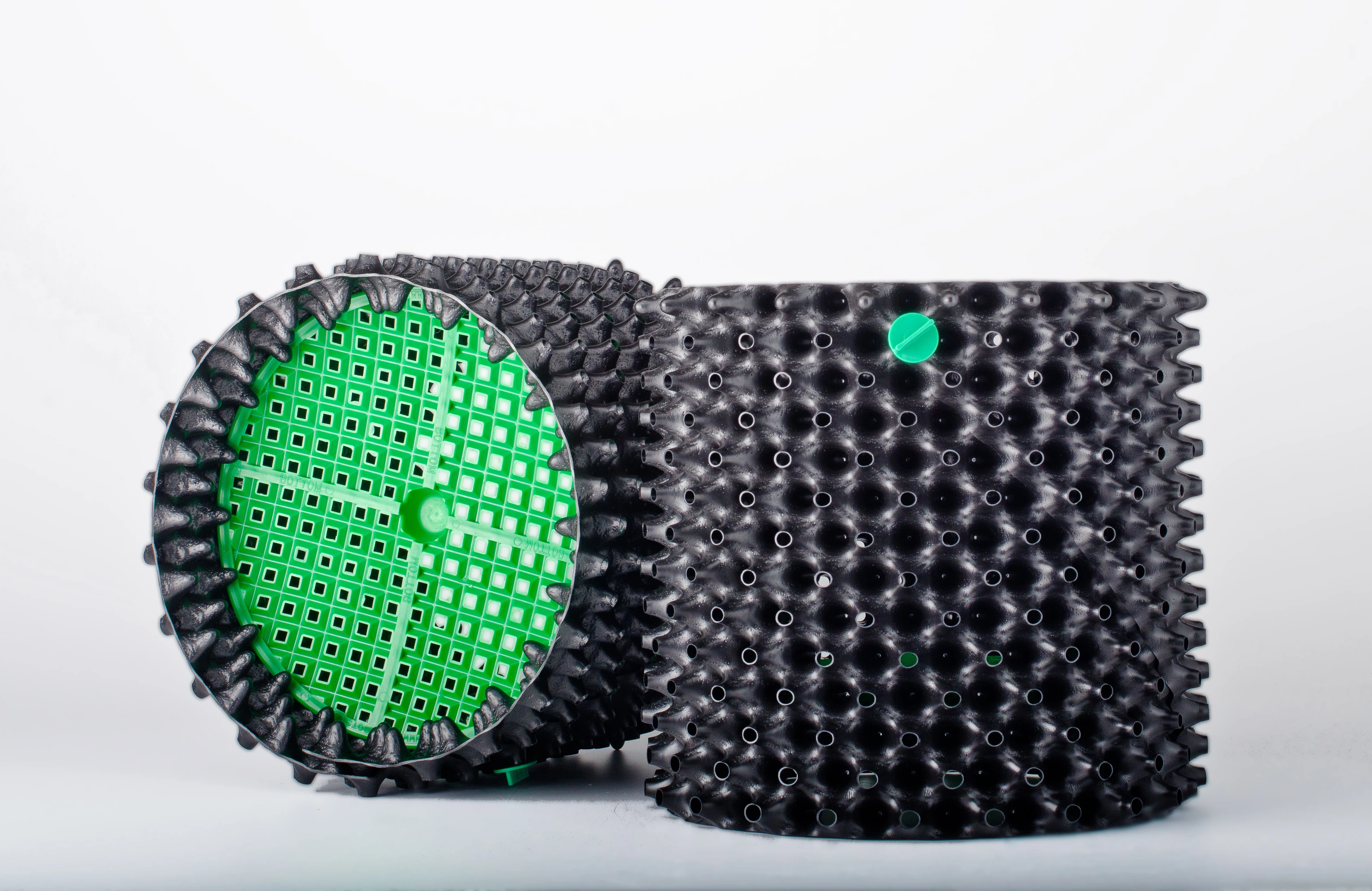 Producida a partir de polietileno de alta densidad reciclado, Superoots Air-Pot tiene forma circular, con una pared perforada que está diseñada como los cartones de huevos. No hay superficies planas para que las raíces inicien el proceso de espiralización.